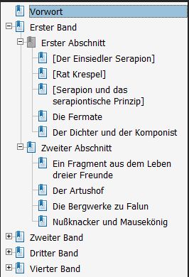 Manche meiner PDF-Dateien haben Lesezeichen mit mehreren Hierarchiestufen (siehe Bild). Das Buch "Die Serapionsbrüder" von E. T. A. Hoffmann besteht aus vier Bänden, die jeweils noch in Abschnitte und einzelne Erzählungen gegliedert sind. Wenn links neben einer Bezeichnung ein Pluszeichen steht, heißt das, dass sich noch eine weitere Ebene ausklappen lässt.