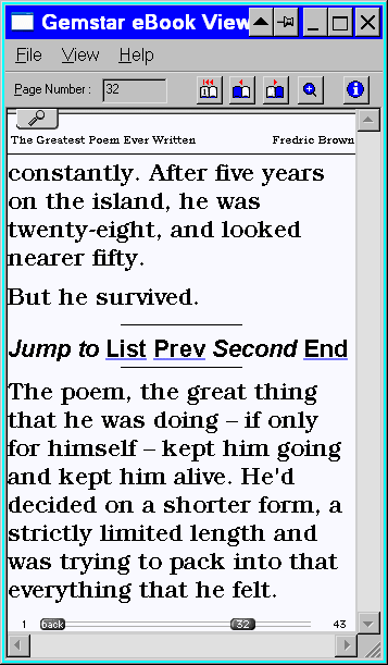 I have also tested it with a Rocket eBook formated book (.rb) that I got at Blackmask. It displays beautifully. The fact that it will display .txt, .rb, and .html opens up whole worlds of books and documents. I have only had it about 72 hours - battery life seems long but I'm not sure how long. I thing there is a way to bookmark and also make margin notes but I have not really tried that. Something else I like, once your internet based bookshelves are stocked with either books you buy at eBookwise or your own content on your personal shelves the 1150 can download it directly without a computer through it's built in modem. It automatically dials in through a tollfree number. A nice feature if you are stuck at Grandma's house over the holidays and need another book. |