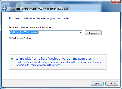 I think you're forgetting the step 'I want to choose from a list of drivers on my computer' option. Don't let windows look for the file, you have to point to the file, not just the folder.