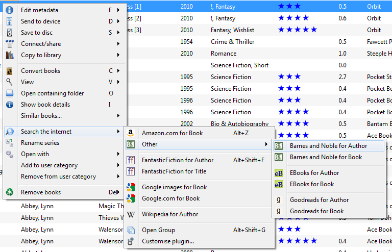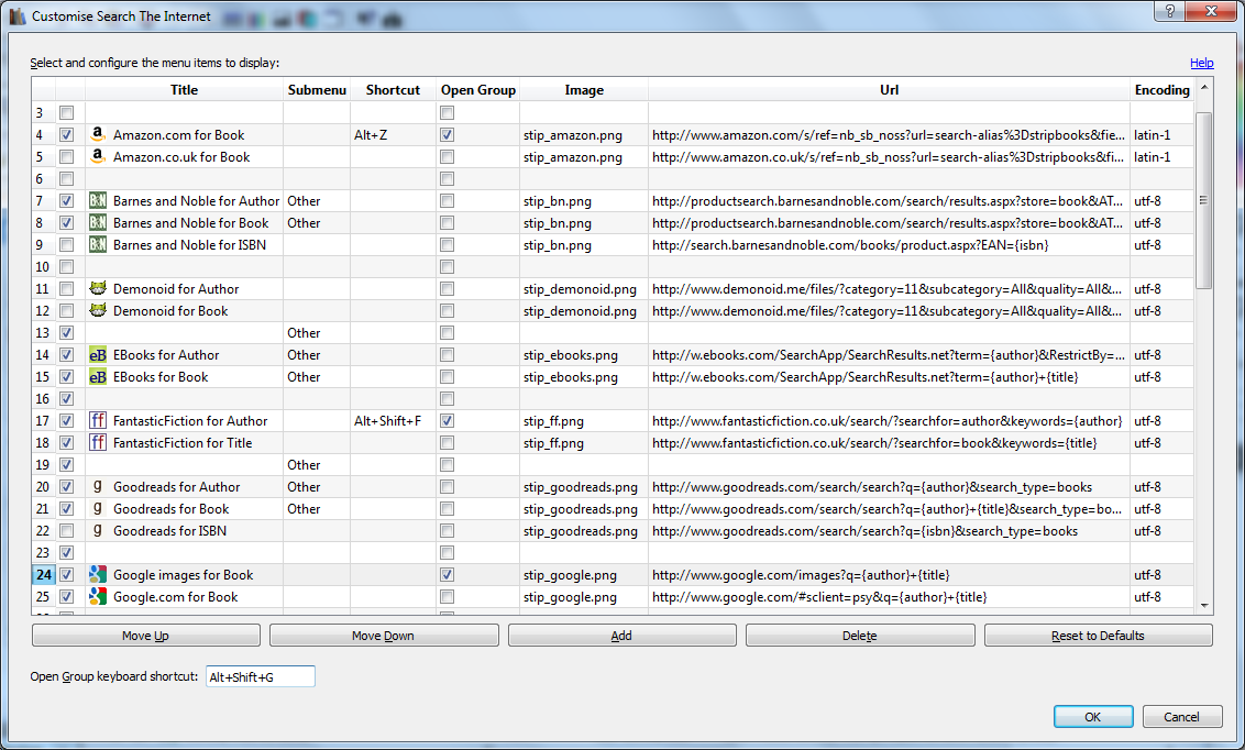 My current alternative to this was to add the option of keyboard shortcuts for each menu item, so at least you didn't have to move the mouse and right-click etc, though you do have to switch focus back to Calibre first of course. I see from your tweak config above (thanks for those btw) that you hadn't as yet upgraded to 1.3 of the plugin I posted last which supports shortcuts. I guess my question to you is once you do have keyboard shortcut ability whether they would assist you sufficiently to not need the feature? EDIT: Sorry, I just looked closer at your URLs and now see you do have keyboard shortcuts configured so are using 1.3. Guess that answers my question about whether you still want the feature ![]() However if others want this feature too (and they respond here soon enough!) then I'm happy to consider it. The difficulty is how to represent this without making it all too complex for everyone who never wants it. One approach that comes to mind is to add a second checkbox column to the grid that you can tick for each row you want to be part of an "Open multiple sites" menu action. This menu action would appear at the bottom of the menu if it had any "members" ticked and would be possible to have it's own keyboard shortcut configured too. As I said if others think it would be useful or have ideas for alternative simpler implementations then speak now...