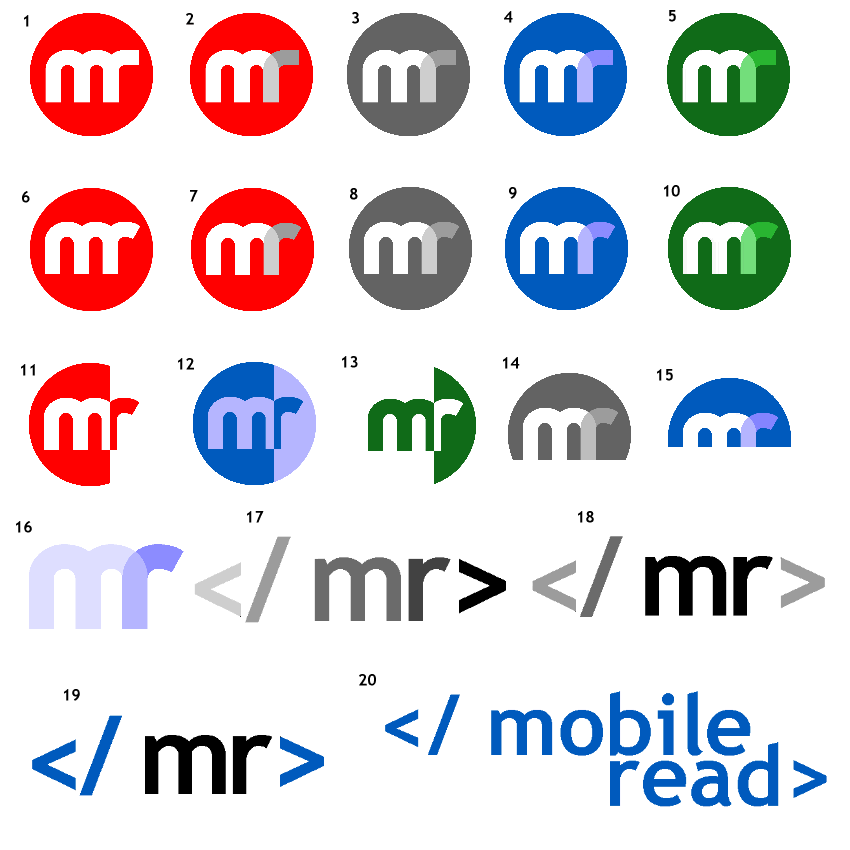 I concentrated on trying to create a distinctive, simple graphic that should scale well from very small to very large. Most designs are built around the letters mr and use very few colours - 4 at most (not including the background colour). The first 5 logos use one form of the "mr" logo I came up with (straight bar for the r), logos 10 through 16 are based on a slightly different, more rounded form. 17 through 20 are made up to look like xml/html tags (taking the linebreak tag as inspiration). Since almost all ebooks are marked up using similar tags I thought it would be appropriate. My favourite is logo 9. |
