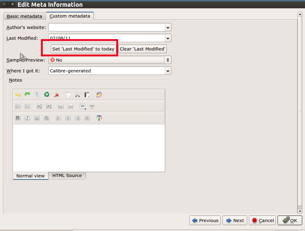 I added "Last modified" as a new custom column, of type Date. When I'm editing the metadata for a book, if I go to the "Custom metadata" tab, I see, under my "Last Modified" field, two buttons one. One of which is "Set 'Last Modified' to today". That's as close as we'll get for now to what we're looking for. It's not fully automatic, but it's just one more button click. |