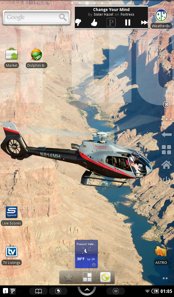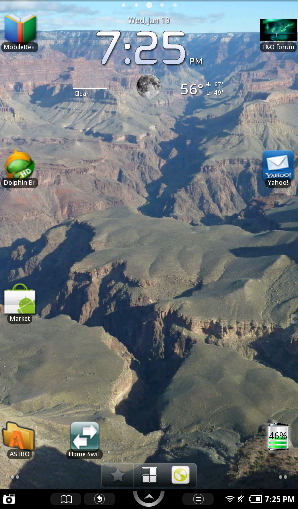 I'm still getting used to the push the "N" and up volume to take a screenshot....My main page has a few apps, mostly net stuff.....the next screen has book stuff, and I have a few games on another..... Still a work in progress....but it's cool the way the background moves to the next section of the canyon, when you swipe to the next desktop screen...... Picture was taken by me on a recent trip there ![]() Oh....I haven't actually figured out how to add something to the favorite button in the drawer.....or change the web browser in the drawer to use Dolphin (it still uses the same stock browser )