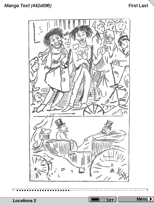 What I've uploaded are some old manga images taken from wikipedia and marked as copyright-free. These are from Hokusai and Kotaro, and by size and proportions they fit our needs. Also I noticed something interesting. When I build a Mobipocket format book made of jpgs, the image displayed as "cover" will have no borders, thus using all the screen's space. When one starts reading the next pages, the borders appear. Maybe there's a way to mark more images with the same "cover" characteristics so they all fit the whole screen. I'll try with tompe's suggestion, but now I must leave for home. See you in some hours. Thank you guys. |