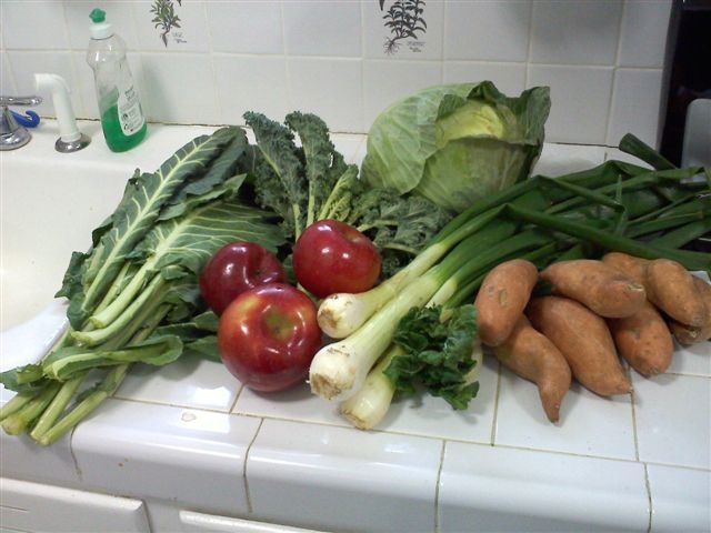 I joined a new CSA (Community Supported Agriculture) this year, and I picked up my first 1/4 share weekly box (suitable for one person) today. I think I'm really going to like this one because it's a multi-farm one, which can give a little more variety. It's still pretty early in the season, but this is what I got. Just finished eating a baked sweet potato, collard greens, and some brown rice. Yum! They also offer add-ons, and I got the cheese add-on today -- natural rind cheddar and mild goat cheese. OMG the goat cheese is so good I just had to put it out of sight to stop eating it!