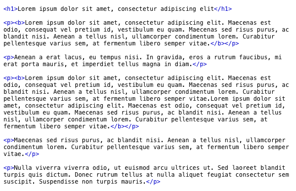 <p class="calibre3"><b class="calibre6">Lorem ipsum dolor sit amet, consectetur adipiscing elit. Maecenas est odio, consequat vel pretium id, vestibulum eu quam. Maecenas sed risus purus, ac blandit nisi. Aenean a tellus nisl, ullamcorper condimentum lorem. Curabitur pellentesque varius sem, at fermentum libero semper vitae.</b></p> And the styles definitions are: .calibre3 { display: block; font-weight: normal; margin-bottom: 1em; margin-left: 0; margin-right: 0; margin-top: 1em; text-align: justify; text-indent: 1.1em } .calibre6 { font-weight: bolder } Last edited by marekl; 01-21-2011 at 05:27 PM. |