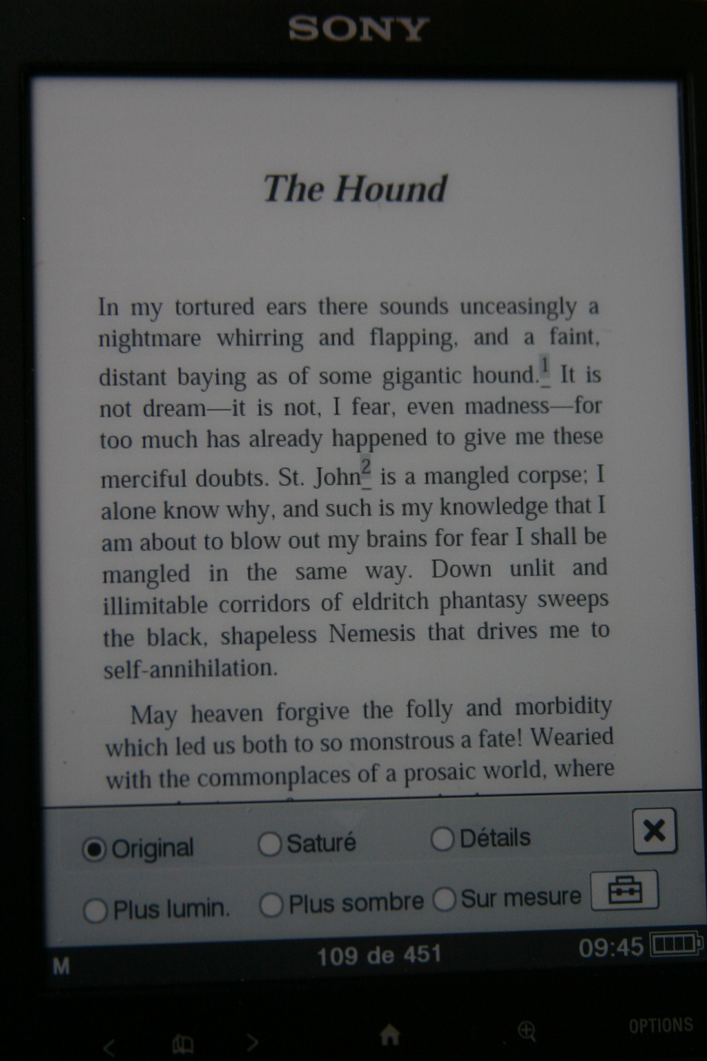 Anyway, it has some weird effect, like when putting the contrast at max. and reducing the brightness, the "background" is still the same white until you reach -127, below that the background become darker. So if you do that (contrast at max and brightness at -127), depending of the font used, you obtain something like a bold font, but a bit messy (see pictures, although I was not at max contrast and brightness when taking the picture -127). It's kind of repelling because it's too bold, but at the same time the text is darker and the small irregularities makes it look like a bad printed book (ok that didn't sounded positive, but the idea is the irregularities adds a bit of "organic" to it). I don't know which one I prefer at the long term, maybe I should try to replace the font used in the book (my 650 is "russified", but this book is borrowed from a library, and I guess it uses it's own (embedded ?) font). Anyone think replacing the font by a bolder one can achieve the same result ? Like the font used in the Kindle, it always seems to me (on photos, never saw a Kindle 3 in real life) that it has better contrast, but then maybe the readability is not that great. |
