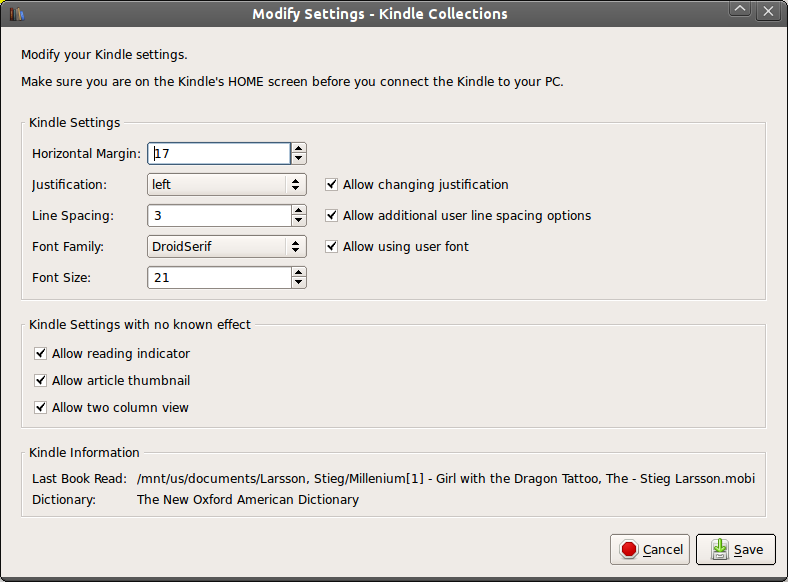 Modify your Kindle settings including horizontal margin, justification, and fonts