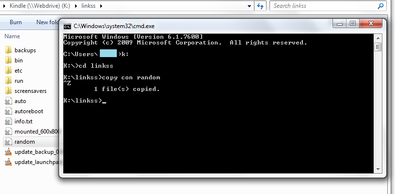 2. Type in your Kindle Drive Letter (K: or some other letter) 3. Use cd command to go to the linkss folder (cd linkss) 4. Run "copy con random" press enter then Control-Z then enter 5. Verify that it appeared in explorer Last edited by kranu; 01-29-2011 at 08:54 PM. |