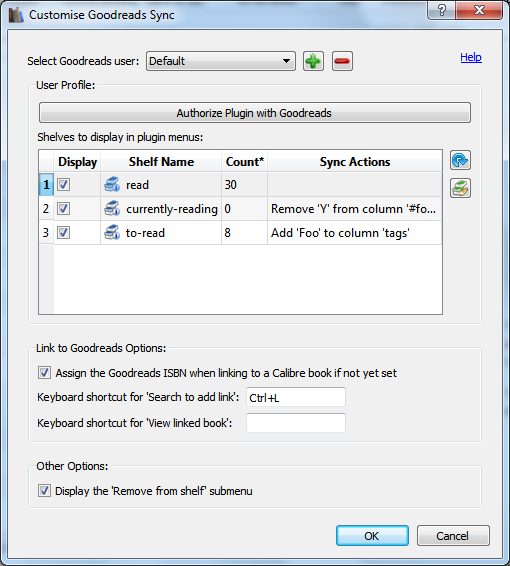 The "Sync from shelf" functionality has made it into this first version, I decided it was too much fun to leave out. It allows you to specify a number of actions to be performed for each shelf, such as adding/removing tags, or adding/removing values from custom columns. So for instance you could set a #read Y/N custom column to Y for books on your 'read' shelf on Goodreads when you sync from it. I'm pretty much done with the development other than fixing any bugs and addressing any suggestions for usability improvements to menus/dialogs etc. So if you fancy giving it a test, please drop me a PM with your e-mail. It's about 3,000 lines of code and certainly the most complex plugin I have written to date so there's bound to be something I have missed along the way... |