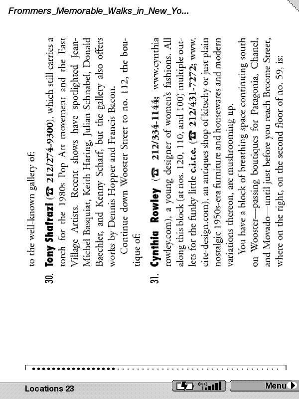 The second one, I had to convert the PDF to be image based, (turned it into a 20 meg file) and then emailed it to Amazon to be converted. The result is much better in that the result looks like the original PDF, but as you can see, the text is not optimized for the reader and it is hard to read smaller text. Also all maps (non-standard images) were badly resized to be very small making them unusable. (bad image fidelity)