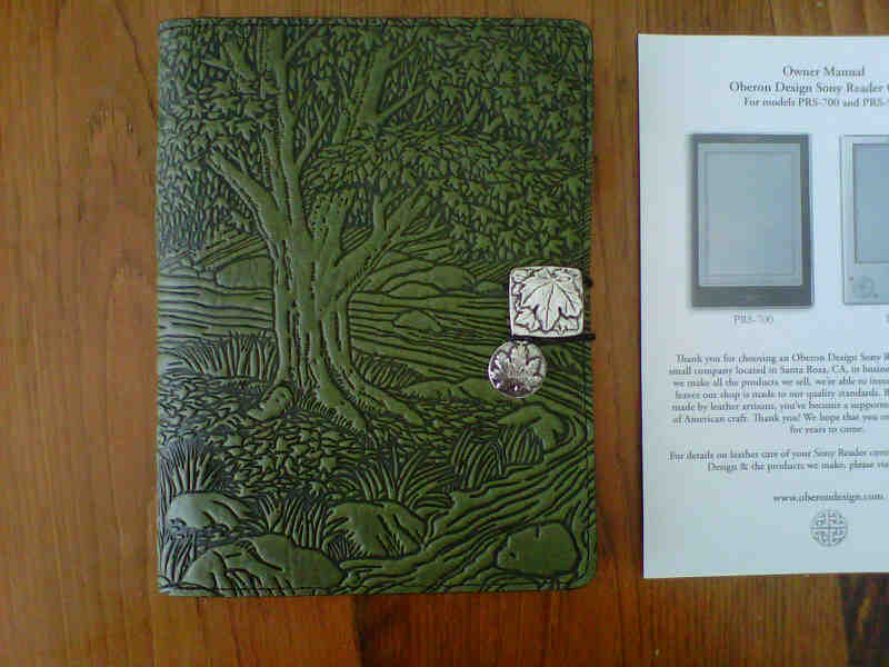 ![]() I scoured all over trying to find pics of people using Oberon 600 covers with their 650s, but could really only find....not much. I looked for ages on various boards, as I'm up in Canada, but was going to have it shipped to our cottage stateside, and billed to my father's Visa (tore mine up after Christmas lol!), and this that and the other...so I wanted to be sure about what I was buying. I initially thought I'd get the Kindle3 cover, so I'd have room for an e-luminator2 to slide down the middle inseam- I don't like clips on the top (like the mighty bright and such), wanted to have it always in the cover with the book. Plus I have two kids under 5 who'd LOVE to wander off with a light clipped on the top I'd read that they were still selling the old 600 covers for 650 users, but wanted that room for the light...WELL! No problem!The girl I was emailing back and forth at Oberon (Amy?) was so helpful and tolerant, and I ended up just emailing them the Visa # and address, and dad just dropped it off on my doorstep today. Awesomeness ![]() Anyway- some pics. Bigger than the Sony cover my husband gave to me, but feels smaller- maybe because it isn't so flappy with the bungee closer. Such a nice leathery feel to it with the bumps and hollows. Colour- seems true to the web pic on their site. Durability- good thick covers, bends back nicely. I used to have an Astak pocket pro (?), and that faux leather cover was substantially nicer than the Sony 'leather' one, in that it had the magnetic closure. Why would Sony charge that much just to insert a light and knobbies to hold it in place when it just flaps away? Glad he got it for $30 instead of $50CAD. I'm rambling, forgive. My kitchen table is a honey pine colour, just left the white leaflet in to show against the green. And of course who doesn't like a lil' semi-naked screensaver. I actually have 7 pics set for the slideshow, never know who I'm going to open the cover too...Sawyer...Jason Statham...Christian Bale...lol Best feature on the 650 ever! That, and I figured out last night how to just bulk convert all my books to have the Caecilia font vs. the Sony font. Dead easy once you figure out Calibre. Anyhoo... |