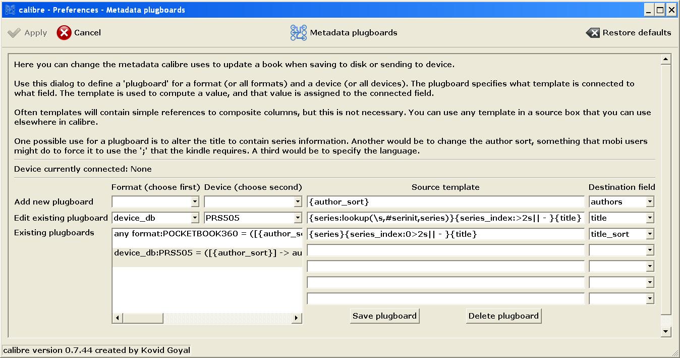 Format: device_db Device: PRS505 Template: {series_index:0>2s| [|] }{title} Destination Field: title Save the plugboard. Read this post for more information. |