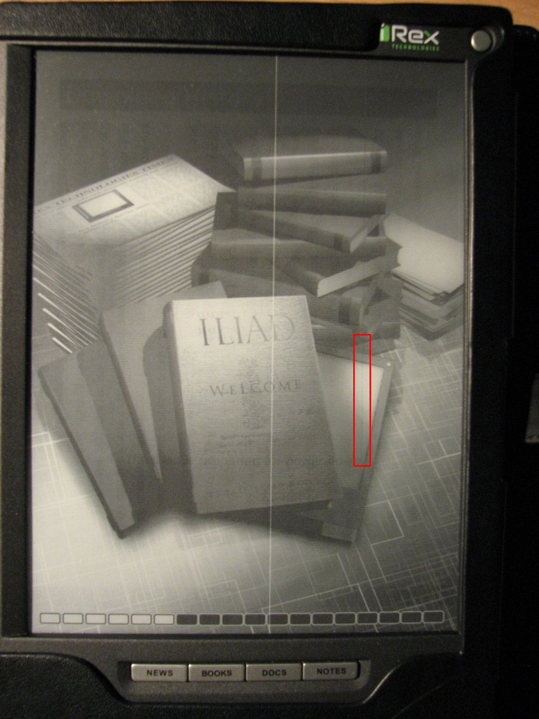 Hi, I was quite surprised to see your pix of your defective iLiad display because my defect is so similar. I have been emailing iRex tech support back and forth, and so far they have not been helpful though I can see from your picture and the other comments that this defect of mine is not particular to my device, but instead a not uncommon defect that the iRex tech people should have immediately recognized. Please anybody else who has info on this unfortunate circustance, weigh in! Thanks.