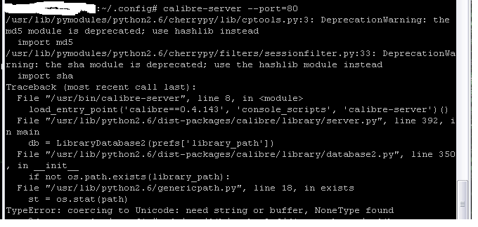 Since I couldn't make any head way configuring Calibre through the cli I tried to do it through a GUI and I get an error when I try to create the library and can't go any further.