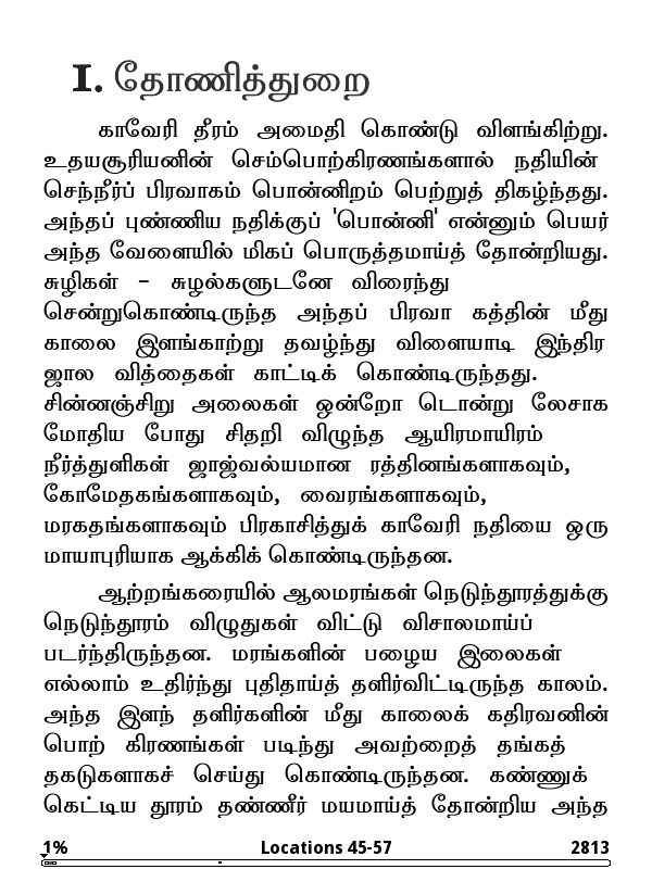 My gripe with PDFs were : 1. They were a bit bulky as they embed fonts as bitmaps, and sometimes crash my kindle (Ponniyin Selvan books was several MBs in PDF). 2. They dont provide us the ability to resize the text when we want to. I really hope that Amazon starts supporting Tamil unicode officially so that we dont have to deal with these conversions and hacks. |