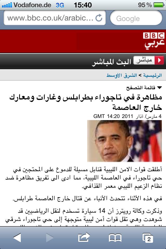 I bought this week the PB 903, which is really an excellent device . One of the important reasons why I ordered this reader was to read news paper in the web, it looks fine except the issue of displaying Arabic Web Pages: Arabic alphabets appear in the right order (from right to left) BUT letters are separated!! I am attaching 2 screenshots of a web page (Arabic BBC) and how it appears on the BP reader and same page on my iPhone Even tried to change the language of the device from English to Arabic did not solve the issue Can you please advise what I can do in order to get Arabic HTML pages displayed correctly? PS: I have seen there is an option in the web browser under encoding to select "Custom" Is there a way to add manually any files there which would help to read Arabic properly? The device firmware version is: D903.2.0.420110106_160908 I checked the date of the SWUPDATE.BIN file in the root directory: Last Modified 20. January 2011, 18:32:00, which seems to be the latest one ? I really appreciate your help Many thanks in advance |