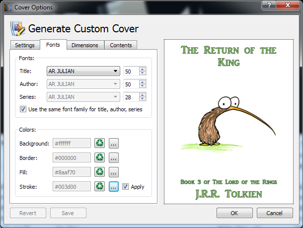 One thing I am going to add is a checkbox for allowing a user to "link" the fonts for title/author/series. So when checked if you want them all the same changing one combo will change the others to match. In theory I could do something similar for text on the cover. Just got to figure out how to fit everything into the dialog Maybe I should give up on the 3 pane approach, and use 2 panes with the left pane being a tabbed one for all the pages of options and the right an image preview.Quote: