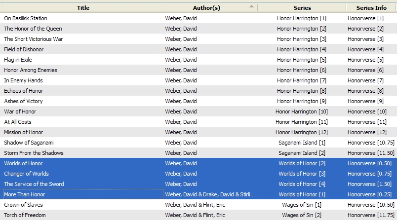 I now have the complete Honor Harrington/Honorverse series, including 4 of the 5 anthologies. My issue is that the stories in the anthologies are spread out over the series, so I can not put them in a specific order. For instance: One of the stories in More Than Honor goes before book 1, but another goes after book 7. How (if at all possible) can I at least show a place holder for a specific story from a specific anthology? Would creating an "empty book" help? If so, how would you suggest using it, so that the stories show up in the correct order? Lastly, what do I have to add/change in tweaks, so that all of the Honorverse books & stories show up in the correct order? Here is what I have now: Code: