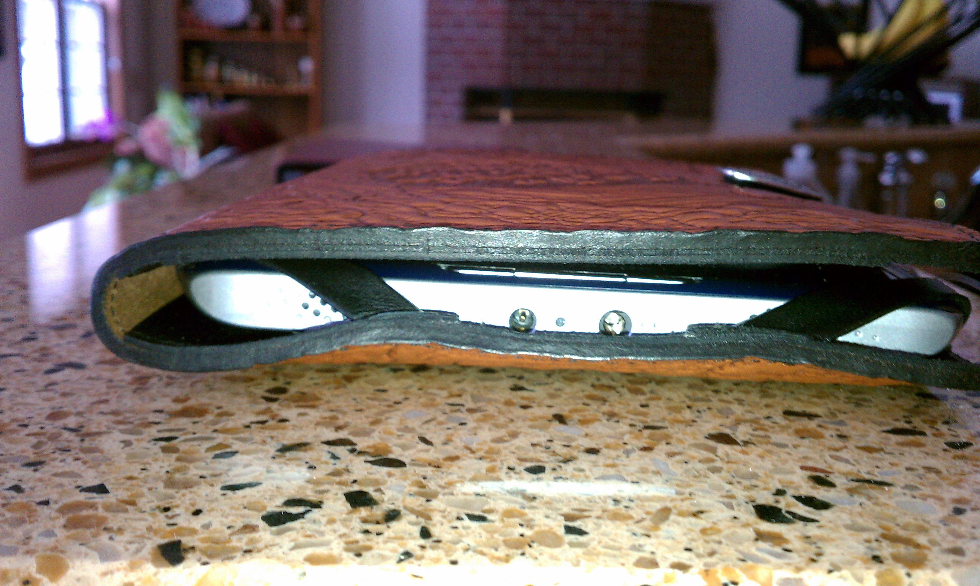 ![]() I've been using my Oberon case for my IQ for the last two weeks, and it's pretty nice. They don't make a version with Velcro anymore, so I've got the straps. The bungie for the right corner is superfluous; the fit is fairly tight and so once you've slide on the other three leather corner straps, you don't need the bungie at all. So far so good; the case is wide enough but because the fit is so tight, the leather doesn't lie exactly flat. I've included shots so you'all can see. As you'll also note, the top left corner strap hides the on/off button, but since I use a stylus, this isn't a problem. Will I keep it? Sure. I like the look and because the fit is SO snug, there's no danger of the thing popping out. You know . . . it works |
