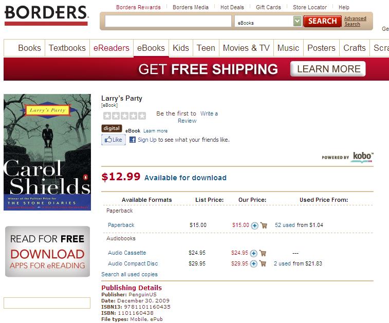 In particular, I'm trying to find an ebook copy of Larry's Party by Carol Shields available in Canada. What makes this example really burn me is that it's a Canadian novel, with Canadian characters, by a Canadian authour. But it's (presumably) an American publisher, so I can't get the freaking book! Any way to get around this? I'd love to get a copy of this book for my ebook collection, and I don't have the resources to move to the States to get it.