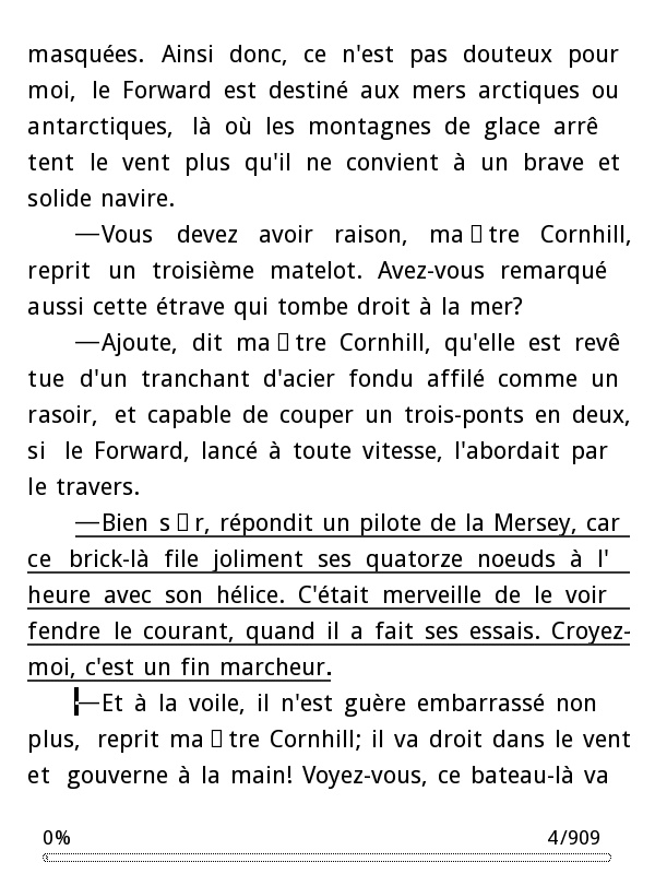 Actually I tried too to download a book from guttenberg at the result was surprisingly better than I had before. Accents are now in the same font than the rest of the text. I was sure my previous text file was UTF8 too, so I have to test that again. (I am with Ubuntu at home) The biggest problem is the text format, words with accents are truncated. I finally managed to do a printscreen thanks to you, and reported in one page the three common issue we meet with three dot colors, but there are probably more. (You seems to have problems with the î letter on your printscreen) But it is a good step for me I can deal with that for now. And I have to say, I really love Duokan. The category page is perfect (multiple folders, what a dream to organise my pdf articles) and it is far better to read mangas on it than the buggy amazon one. Happy user here. |