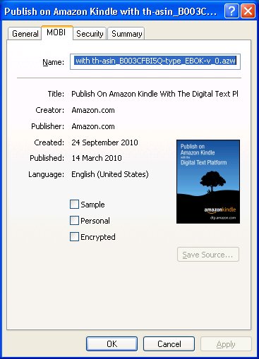 I like that the properties -> MOBI page includes indicators for samples and encryption. |