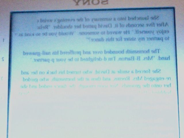 I'm going to try to attach a picture (first time trying that). In the picture, the blank square is in the top left (the image is reversed, as you can see from the words). Now I really need a nice black 650 to fall into my lap! Where's the ereader fairy?? (it looks like the words fade out towards the bottom, but that's because I used the photo booth on my mac and the flash made the words fade out) |