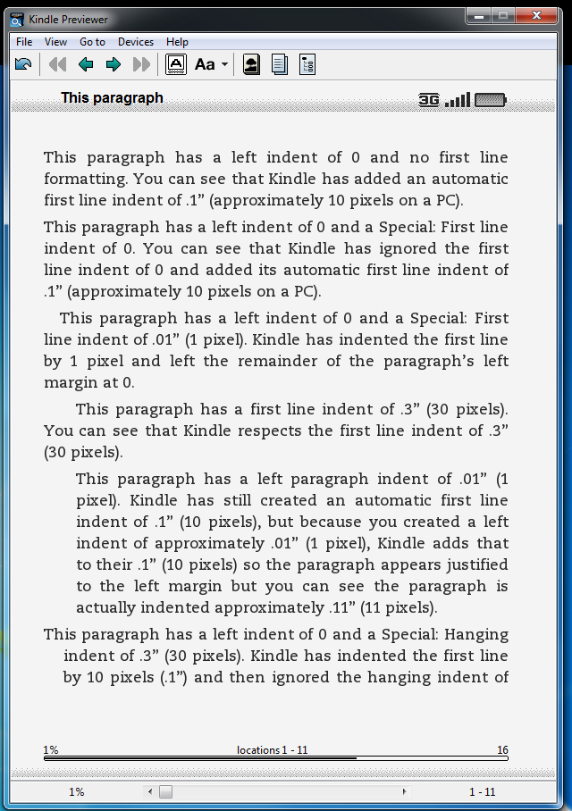 I've been experimenting using Word's Save as Web Page, Filtered for upload to Kindle, but as you all probably know, the Kindle does weird things to formatting -- mainly it doesn't respect one's paragraph formatting much (see first attached file). I have found that converting the HTML file to MOBI in Calibre does respect paragraph formatting when tested in both Kindle for PC and Kindle Previewer (see attached two screen shots). I was elated at first because this seemed like a solution to the problem. But I've been told by a Kindle forum user that: "Calibre ... is not a suitable mobi production tool, as it lacks the proper amount of spacing in the headers to allow all the "Kindle For X" apps to run (as PC, Mac, and iPad apps all require a 2nd layer of encryption)...I wouldn't want author-publishers to go haring off after Calibre like it's the Holy Grail of ebook production only to find out that buyers were returning books because they couldn't be read on anything but the Kindle Device itself." Yet, I had a mobi file, that was created in Calibre, converted into Kindle's azw format and it worked fine on my Kindle for PC. This suggests the guy's information is outdated; but before I suggest to others that it WILL work, I'd like to hear from other users or developers. Thanks, Michelle |