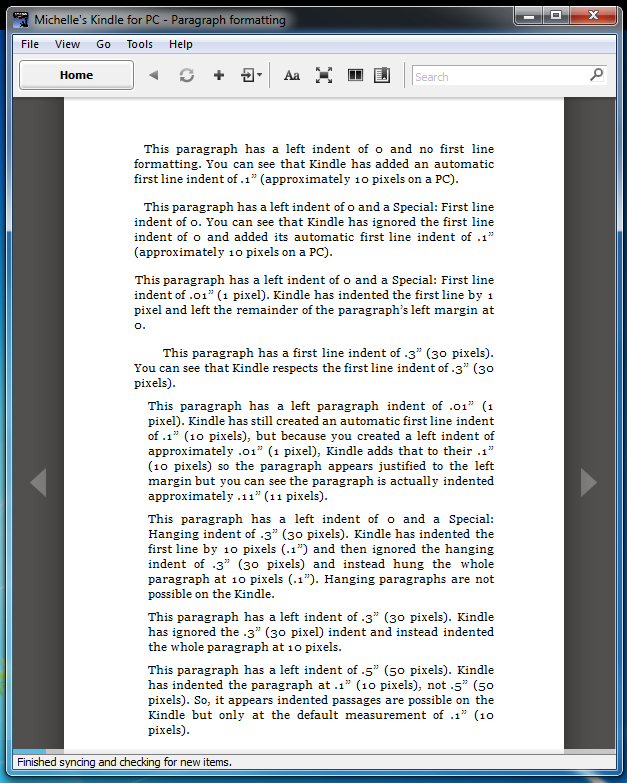 I've been experimenting using Word's Save as Web Page, Filtered for upload to Kindle, but as you all probably know, the Kindle does weird things to formatting -- mainly it doesn't respect one's paragraph formatting much (see first attached file). I have found that converting the HTML file to MOBI in Calibre does respect paragraph formatting when tested in both Kindle for PC and Kindle Previewer (see attached two screen shots). I was elated at first because this seemed like a solution to the problem. But I've been told by a Kindle forum user that: "Calibre ... is not a suitable mobi production tool, as it lacks the proper amount of spacing in the headers to allow all the "Kindle For X" apps to run (as PC, Mac, and iPad apps all require a 2nd layer of encryption)...I wouldn't want author-publishers to go haring off after Calibre like it's the Holy Grail of ebook production only to find out that buyers were returning books because they couldn't be read on anything but the Kindle Device itself." Yet, I had a mobi file, that was created in Calibre, converted into Kindle's azw format and it worked fine on my Kindle for PC. This suggests the guy's information is outdated; but before I suggest to others that it WILL work, I'd like to hear from other users or developers. Thanks, Michelle |