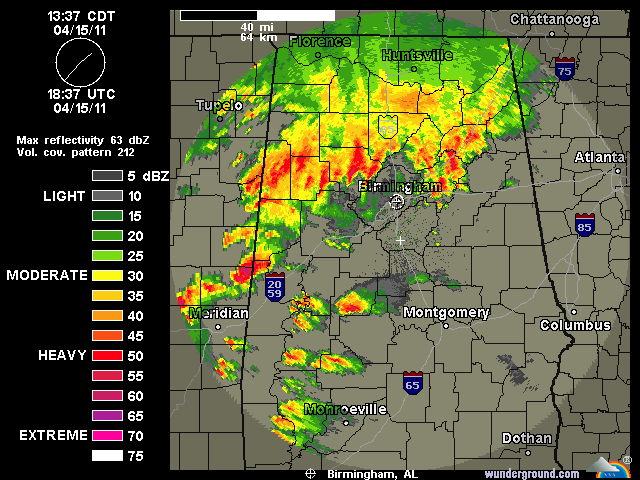 The weather guy just said, "...the biggest super cell of all time. Strongest I've ever seen..." Lots of damage already. Look at the southeast map at the Weather Channel website. It is a monster!