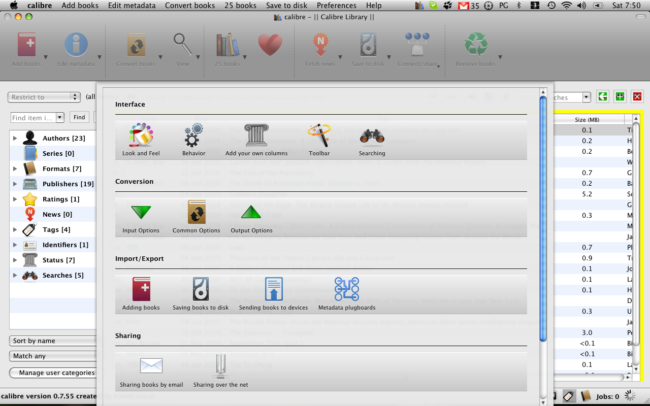 Ok, there are a few things going on here. First, when I posted my comment, I'd already re-installed 7.54 so was writing from memory of 7.55 and making some assumptions. I should have included screenshots, but I was assuming others saw the interface the same way I did. I'm now running both so I can do screenshots and compare issues. It is not 2.5x taller, but it is more than 5 pixels larger as can be seen in my screenshot. The difference is significantly greater when switching to small icons since the icon bar itself doesn't resize - see screenshot. Yes, I've restarted the app and tried changing other settings, but the bar doesn't resize. It's also not that there's extra space between the icons - they're all shifted to the right due to the extra gutter space, but when I loaded 7.55, the Help and Preferences icons were gone. When I reinstalled 7.54, they were back. I made the assumption without looking into it that they'd been 'pushed off' the screen. See screenshot. In fact, they're just dropped from the 7.55 interface, and I can put them back. I didn't even notice until now while comparing screenshots that you have added the Mac menu bar!! Thank you, that's what's been missing this whole time, and I can probably get rid of and get used to using this app without the icons anyway. One issue I did notice though is that the Preferences menu item doesn't actually allow you to load the preferences dialog box. For that, you have to go to Calibre/Preferences. That's confusing. When I made the 'unusable' comment, it was more in reference to dialog boxes (such as the preferences and the icon toolbar windows) also getting bigger, and outsizing my screen so the buttons on the bottom are inaccessible. See screenshots. I realize now that if I hide the icon bar, then pull up those windows they fit the screen and I can also resize them so they'll fit later if I show the icon bar again. Last edited by HaoleKai; 04-16-2011 at 05:15 PM. |