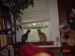 My cats are micro-chipped too, but the collars are an extra safety investment in case they get loose and turned into a facility without a chip reader. I'm contemplating taking Stella outdoors because she is growing so freaking big so fast I think she would benefit from the additional exercise and mental stimulation - and leave the other 2 older cats alone (who have absolutely NO interest in going outside - I can leave the deck door open and both will lie at the threshold and look out but not take a step outside). I know this picture is poorly lit, but can you tell which cat is the 5-month-old kitten and which is the 6-year-old adult cat? |