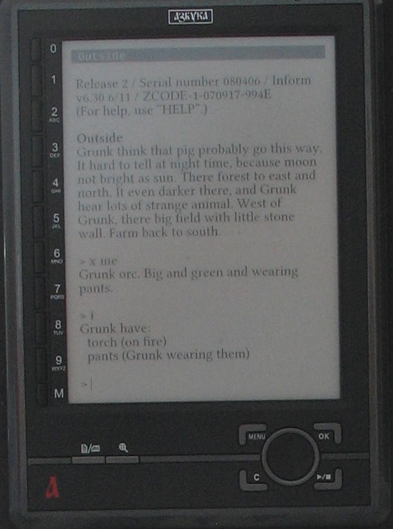I've been working on porting Gargoyle – a popular open source interactive fiction player – to Open Inkpot during the past couple of months. I'd appreciate if you could help me with beta testing. The port works on Hanvon n516 and its clones (with MIPS CPU architecture), e.g. Azbooka. The screenshots attached give an idea of how it looks like. Let me know if you're running Open Inkpot on other types of devices (with ARM CPU architecture), I'll try to build a corresponding package. Here is how to install it. Grab the package from here. Make sure your device is running a recent version of Open Inkpot firmware (see here for details). Connect the device to your desktop computer, following the instructions here. You need to press the Zoom key on n516/Azbooka devices after connecting the USB cable. Copy the package to the device using, for instance, the following command on Ubuntu desktop: [ubuntu-shell]# scp gargoyle-mipsel-2011-1.deb root@192.168.111.1:/tmp Login in to your device as described here and run the following commands: [open-inkpot-shell]# fc-cache -f [open-inkpot-shell]# dpkg –i /tmp/gargoyle-mipsel-2011-1.deb fc-cache will take a couple of minutes to finish. Then restart the device for its file manager to pick up new file associations. After that you can copy IF files to your device and launch them from the Library as an ordinary book. Make sure you read the Help after launching a game for the first time to get familiarized with controls. Press the 0 button after starting a game to get to the help screen. |