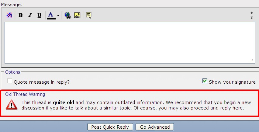 Manichean is correct any thread that hasn't been posted to in over 3 months will display an old thread warning below the quick reply post, see attached.