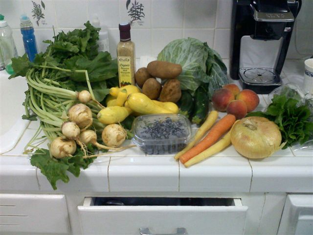 Oh, I wish I could share with you right now! In my vegetable box this week: Summer squash! Zucchini! Vidalia onions! Blueberries! Peaches! Also, turnips with greens, potatoes, carrots, cabbage, and more. So, so good. For dinner last night I had a kind of frittata with turnip greens, carrots, and onions. Sounds weird but it was delicious.