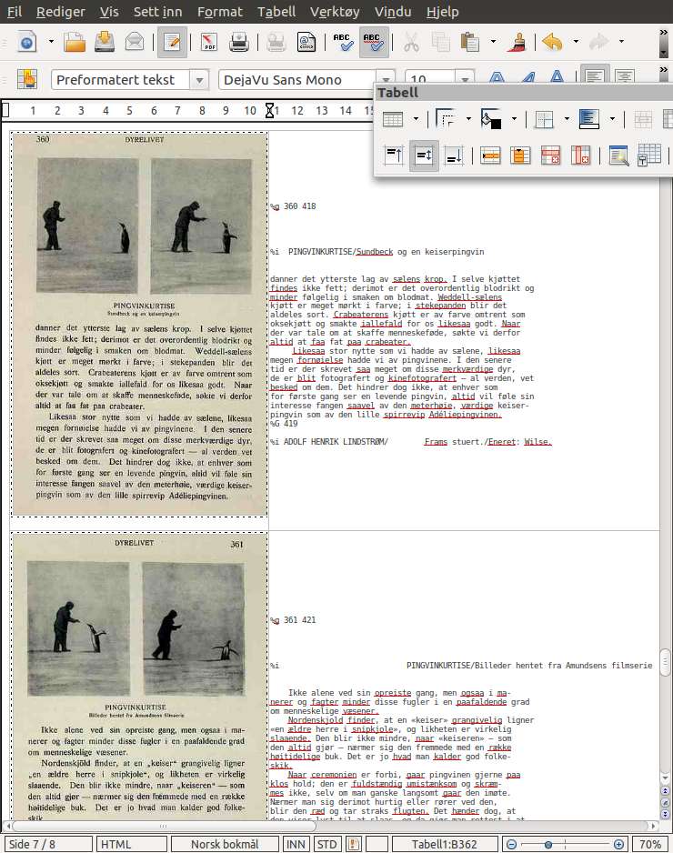 I'm possibly veering somewhat off-topic here, but in the cases where you have both the OCR'ed text and the scanned images of each page, I like to make a two-column html-table with the images on the right and the text on the left. Then I can import that file into OpenOffice Writer, proofread, edit, and xhtml-format it, and save as plaintext. I enclose the bash-script I use on the pdf files of public-domain works available from the Norwegian National Library, and a screen dump of what a file looks like in OOffice. It could work on books from Google too, I think, though it'll probably have to be tweaked a bit.