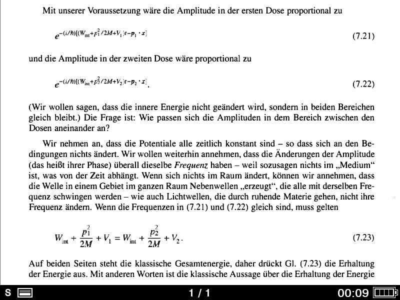 At the moment I try to figure out how to properly read original and scanned physics books. Using reflow doesn't work that good, it just doesn't handle equations well. My main problem is to find the right page size, because the Sony eReader has the odd behavior to add grey margins to not optimal sized books instead of allowing to pan or so. Well, after a lot of trial and error I figured some working measurements which get displayed with a 1:1 scale (sadly it's not a a pixel precise size). Width: 89,4 mm Height: 115,4 mm Right now I test a scanned book, used Acrobat OCR ClearScan and after that resized the page and set the right page size with cropping. sample.pdf It works pretty well and in landscape mode it's nicely readable. And if I can't read an equation, then I can zoom in and pan to the equation: So how do others read PDF files on their eReader? Some tips some tricks? I haven't found that useful information yet, most recommend a tablet without a sunlight readable display, useless for me. It's a bit sad that the integrated PDF reader has so few options. Is it possible to install alternative PDF readers just like the apps which got installed with PRS+? |