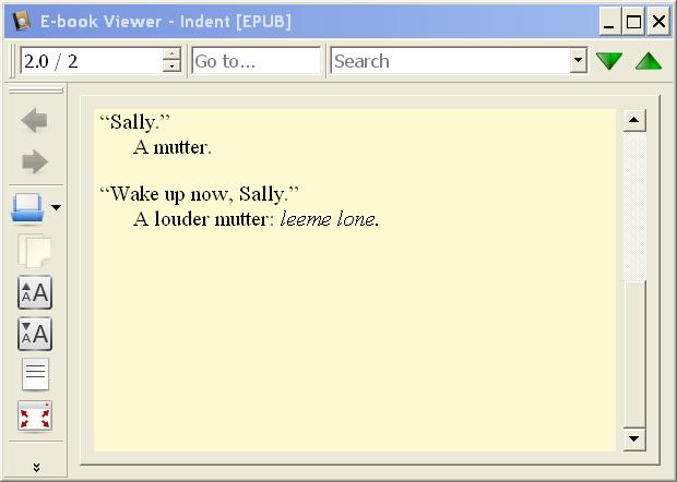 Sally A mutter. "Wake up now, Sally." A louder mutter: leeme lone. Note that this behaviour isn't specific to using something like p+p to control indent. From a converted mobi, the input directory ends up with a html that just has a different class="calibre_xxx" tag for the initial paragraph (which in a browser is correctly zero indented) to the rest of the paragraphs (which are indented). I'm looking for a generic fix here - the example above is just the simplest I could create by hand. Is there some setting I'm missing that controls this? Should I also offer some sort of bonus if someone can identify the book from the first four lines? ![]() Cheers, Simon. |