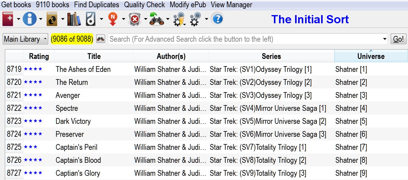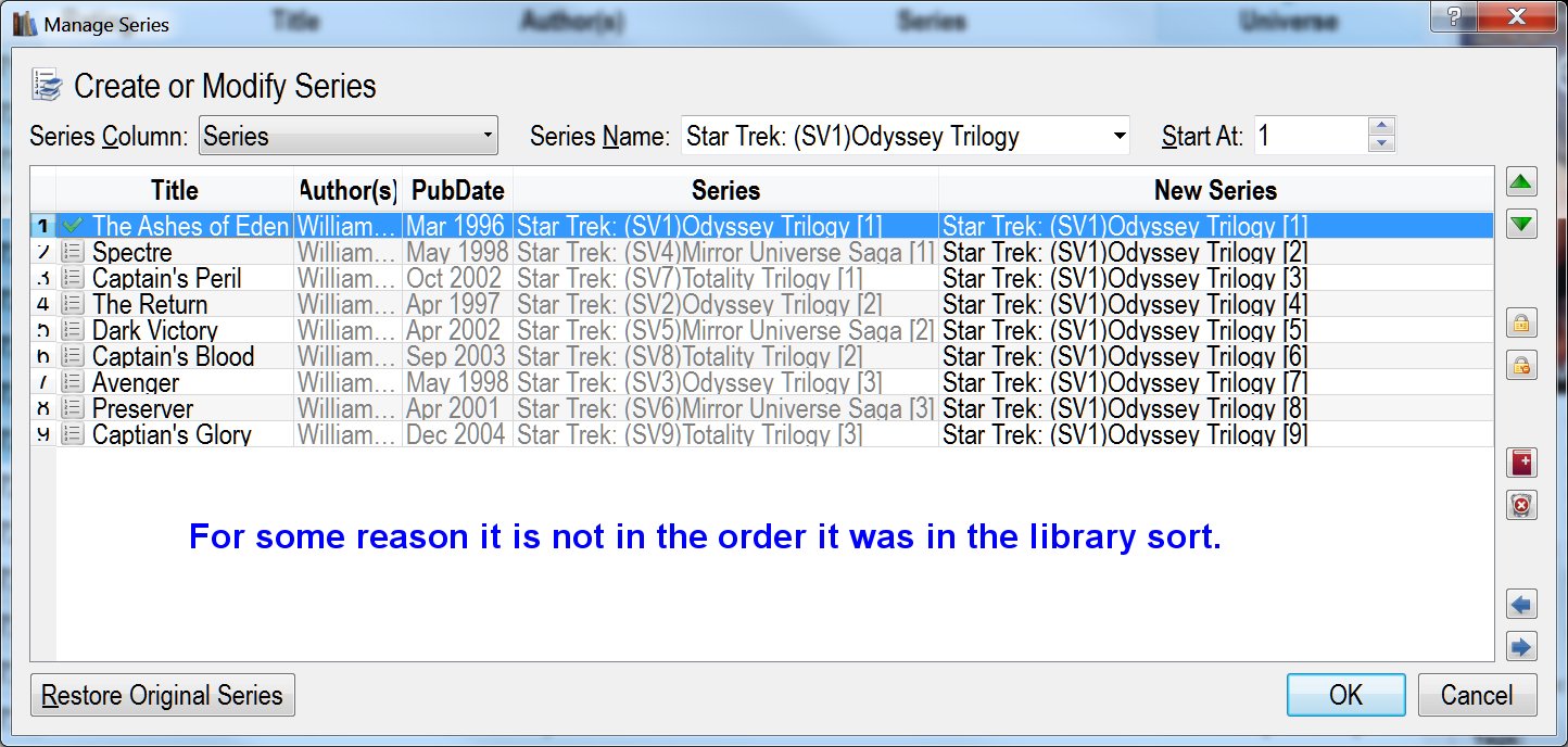 Weird sorting because I had three different trilogies making up one overall series. Quote: