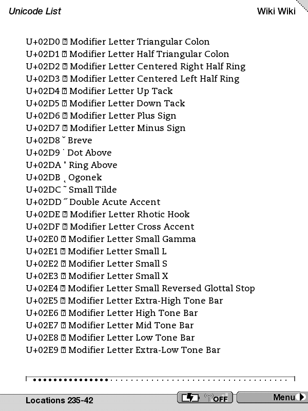 Note that the really interesting glyphs from a eBook perspective are in the range of 200C hex to 2044 but your original sample did not include these. On my decimal page these are the ones from 8204-8260. They have things like curley quotes, emdashes, etc. You might want to try those ranges and see what you get. Dale |