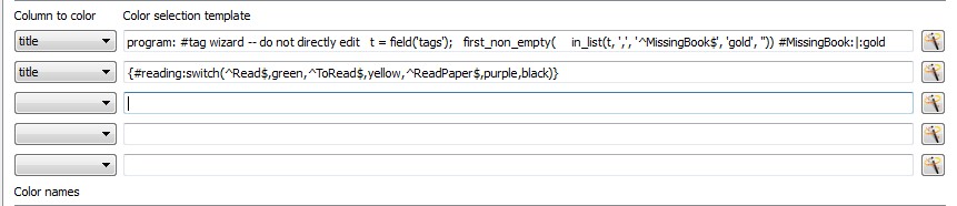 Eg First if tag is MissingBook then Title red Second if Column is Read then title green Last edited by onedot3; 05-30-2011 at 05:51 PM. Reason: Add attachemnt |