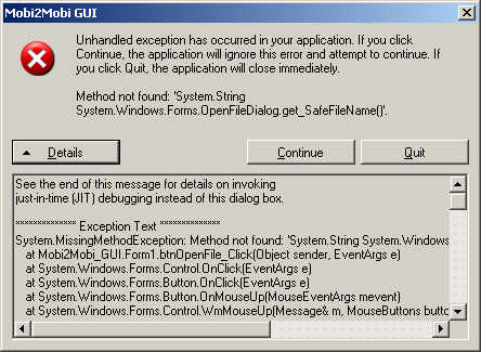 I've just receive a nice crash. I do have the latest .net 2 with all the updates. And I have the latest Mobi2Mobi v36.