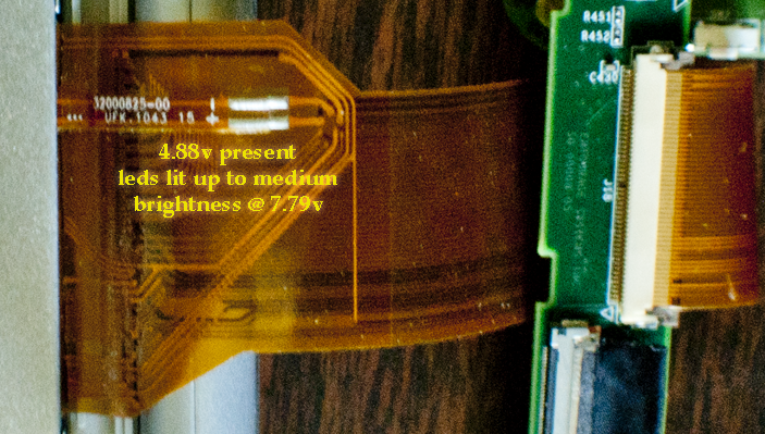 Something doesn't seem right here, I'm not saying your measurements are wrong. just that the backlight should work since you are getting the nominal 5v at point 1. Can you check that you get the same voltage (4.88v) at the + terminal of the LED array. There may be two other explanations, Pulsing the supply to a higher voltage or they are switching the negative supply line. The first is possible but there is no logical reason for the second. |