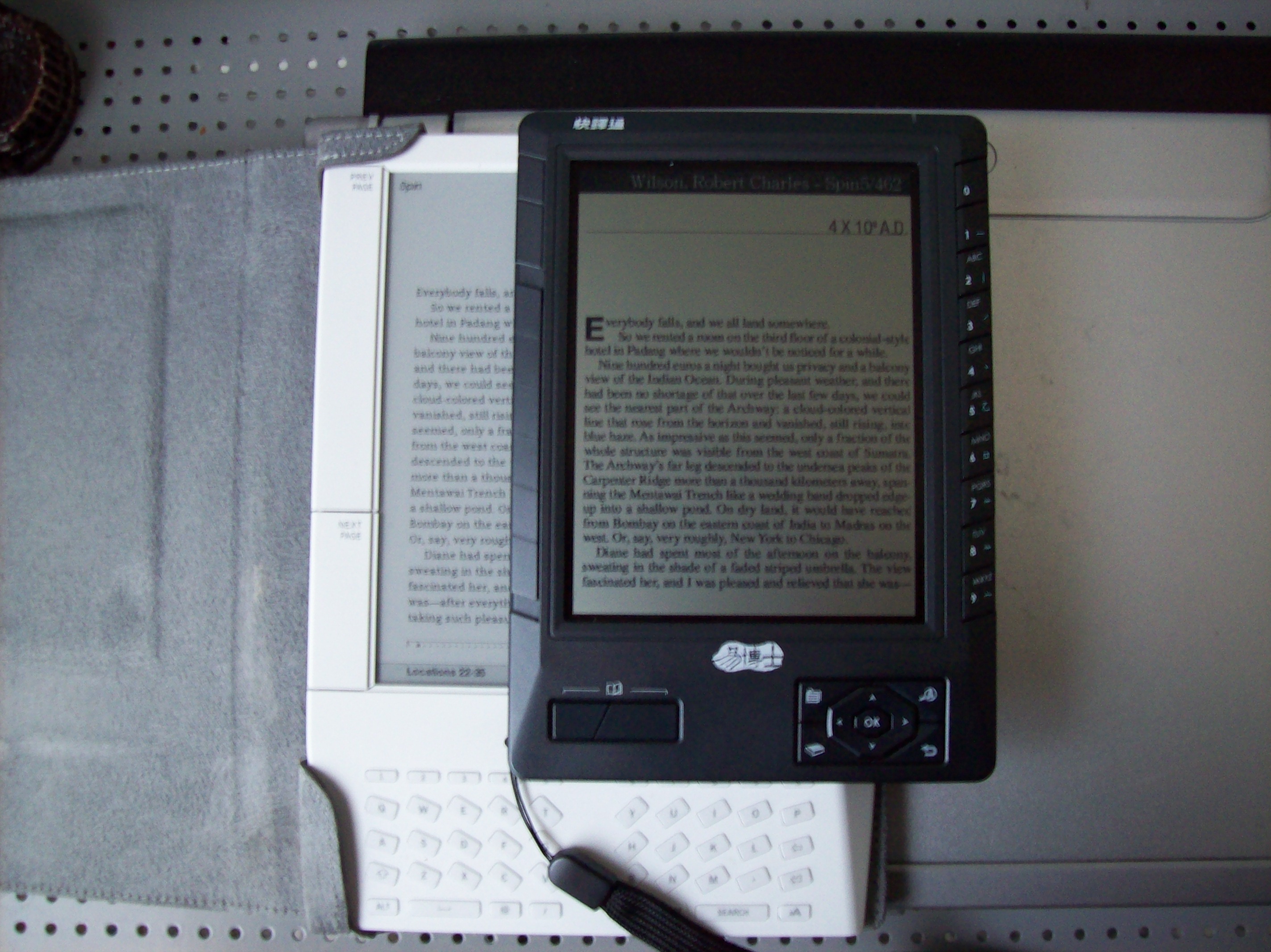 Okay, it turns out I can use the reader while charging it. The screen is sharp. The resolution may not actually be higher than that of the Kindle, but it certainly feels that way. And the refresh is fast. It's an LCD, so of course it's fast. It has a nice GUI menu, with six options: settings, search, ebooks, enews, music, and pictures. I will need to be very careful when looking at the settings; it looks like I might have access to the system settings. One option I have under settings is "execute file". Since I can also delete the file, I guess this means that I might be able to run my own applications. Interesting fact: this device supports folders! Reading experience I made a couple WOLF format ebooks while I was waiting. I can't get them to work. But I really don't care; this device has excellent PDF support. It is hands down the best handheld PDF viewer I have seen so far. If you only want to read PDFs, then you should consider this device. I've tried a couple PDF tech manuals. This is it. This is the Holy Grail of PDF readers. The standard zoom setting is text width. This is very readable. But it also can zoom anywhere from 50% to 6400%. Also, you can zoom in on a 3 by 3 grid, or a 2 by 2 grid. Connectivity It's recognized as a USB drive. No problems there. I can see both the SD card and the internal storage (about 56MB). I can see some interesting files on the device; deviceID.log, PDF.log, signature.log. I can also see two Windows executables called Client and ClientUpdate. They run on my Windows XP laptop. Don't know what they do yet. Music Yes, it can play background music. The MP3 player looks a little ugly, but it sounds okay. The volume can get quite loud. The only things it's missing as an MP3 player is fast forward and remembering your place. I don't use an MP3 player, but i think this one has all the features. Downsides There is no on-screen battery or clock. It's not even an option. I'm really surprised by this. |