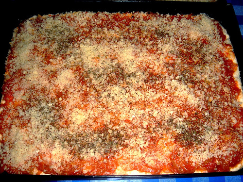NY is the only place I could find, outside Palermo and outside my kitchen, what is known as SFINCIUNI. Ever heard of it? It is a thick crust pizza, made the way around. The crust, prepared to remain soft and a bit spongy, just lightly brown at the outside, then a really thick tomato sauce, heavy with onions, made with fresh tomatoes. Anchoviessssss. Yes as many you can afford. On top the cheese, better if some tasty sheep cheese. Grated of course. Final touch, fresh oregano. Before turning an adept of Pilot the Bob that was the pizza I cooked on Sunday evening for the family. Onions and then more onions.