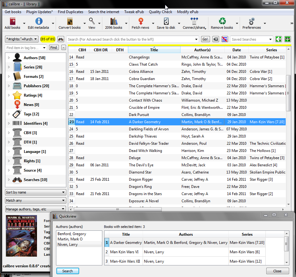 However, (and ) I did like the idea where I could select a book and quickly get a cross-reference of the values of some category item (authors, tags, publisher, series, etc) against the books that have that item. (Kiwidude, this is the function you said you wouldn't use ). I used bits of my prototype and implemented it.