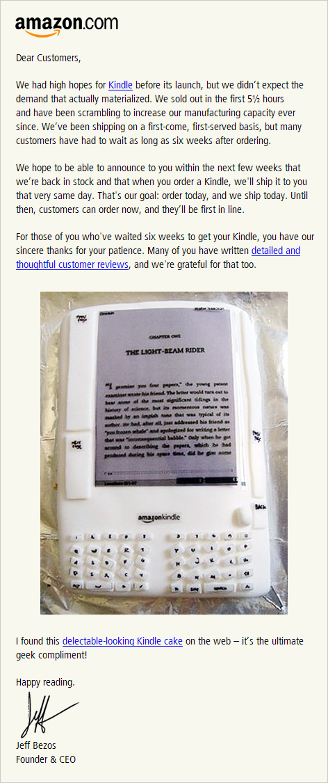 What do you expect him to do? The delay isn't Amazon's fault - it's down to the limited manufacturing capacity of the screen manufacturer, PVI in Taiwan.
