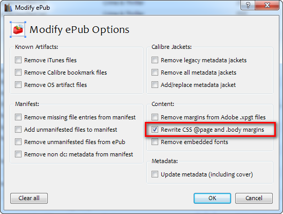 This version includes Idolse's work on the page/body margins stuff, which I believe now reads your Calibre preferences for page margins and then adds them into the CSS stylesheet. As it stands currently this code only looks at the CSS files for .body/@page directives - any that are specified inline in the HTML page are not considered. Investigation still ongoing for the latter. @Idolse - as mentioned above I have (for now at least) made this a separate option within the dialog. We may decide to roll them back together in future but at least this way people can test in isolation. |