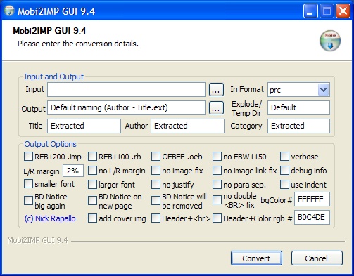 Just download, unzip and install the Mobi2IMP-9.4-Installer.zip attachment followed by the updated Mobi2IMP.exe dos executables in Mobi2IMP-9.4e.zip. Please read the EDIT at the bottom of this post for more information. Mobi2IMP converts non-DRMed Mobipocket .PRC/.MOBI and PalmDOC .PDB files directly to .IMP formats (i.e. EBW1150 .imp, REB1200 .imp, REB1100 .rb and/or OEBFF .oeb/ETI .epub). This project was created by Nick Rapallo and was inspired by PDFRead's .IMP creating module (ImpOutput) by Ashish Kulkarni and 'mobi2html' in Mobiperl by tompe on mobileread.com. Changes in this release: